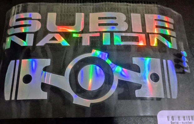 Designed for those who love the Subaru brand and its unique boxer engine culture , the Subie Nation Sticker is the coolest way to show you belong to that passionate community. Produced with Sticker Master quality, this sticker offers a captivating and dynamic look thanks to its special holographic (iridescent) vinyl material that changes color depending on the angle of light. It is extremely resistant to water, sun, and washing.