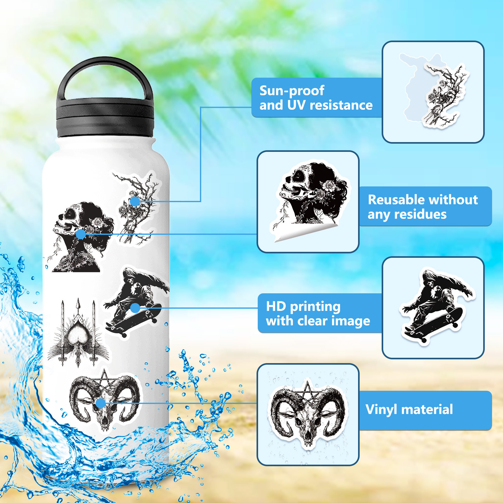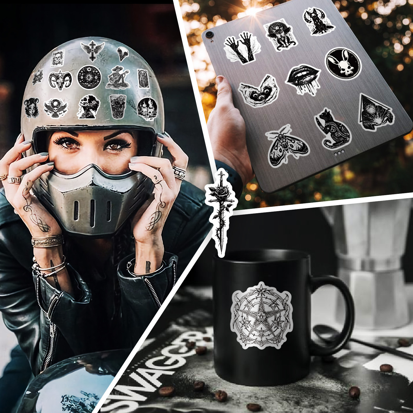 Sticker Master gotik-punk siyah beyaz 50’li sticker setiyle laptop, kask, bardak ve kaykayı cesurca kişiselleştir. Monokrom şıklık seni bekliyor!